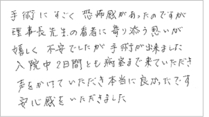 @Žèp‚É‚·‚²‚‹°•|Š´‚ª‚ ‚Á‚½‚̂ł·‚ªA—Ž–’·æ¶‚ÌŠ³ŽÒ‚ÉŠñ‚è“Y‚¤Žv‚¢‚ªŠð‚µ‚A•sˆÀ‚Å‚µ‚½‚ªŽèp‚ªo—ˆ‚Ü‚µ‚½B @“ü‰@’†‚Q“úŠÔ‚Æ‚à•aŽº‚܂ŗˆ‚Ä‚¢‚½‚¾‚«º‚ð‚©‚¯‚Ä‚¢‚½‚¾‚«A–{“–‚É—Ç‚©‚Á‚½‚Å‚·BˆÀSŠ´‚ð‚¢‚½‚¾‚«‚Ü‚µ‚½B@@@@@@@@@@@@@@@@@ 65Î |