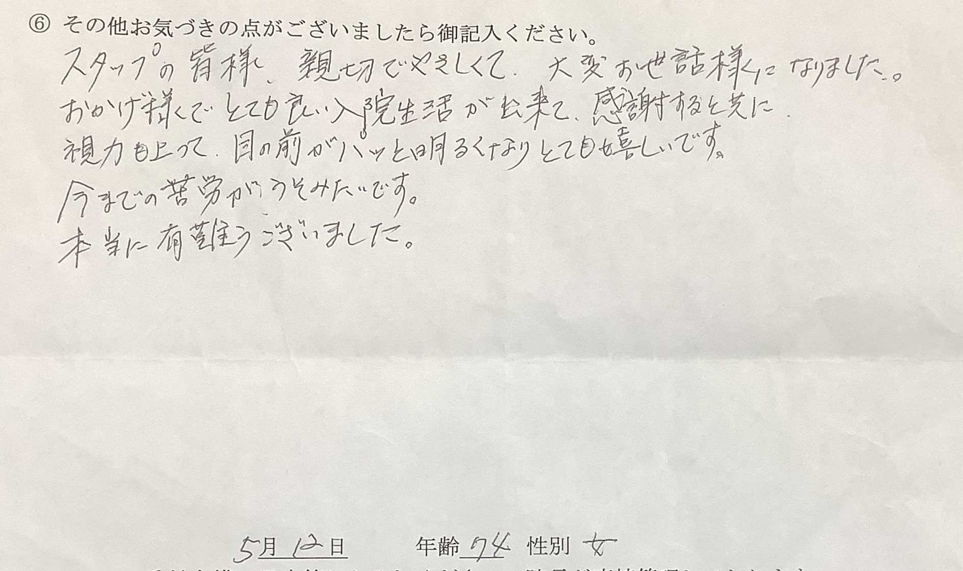 良い入院生活が出来ました。74歳 女性 2025.11.25 2025.12.10 患者様の声 スタッフの皆様、親切でやさしくて、大変お世話様になりました。 おかげ様でとても良い入院生活が出来て感謝すると共に視力も上って目の前がパッと明るくなりとても嬉しいです。 今までの苦労がうそみたいです。 本当に有難うございました。 手術前後の丁寧な対応に安心して手術に希めました。 78歳 女性 前の記事 3歳児眼科検診について 次の記事