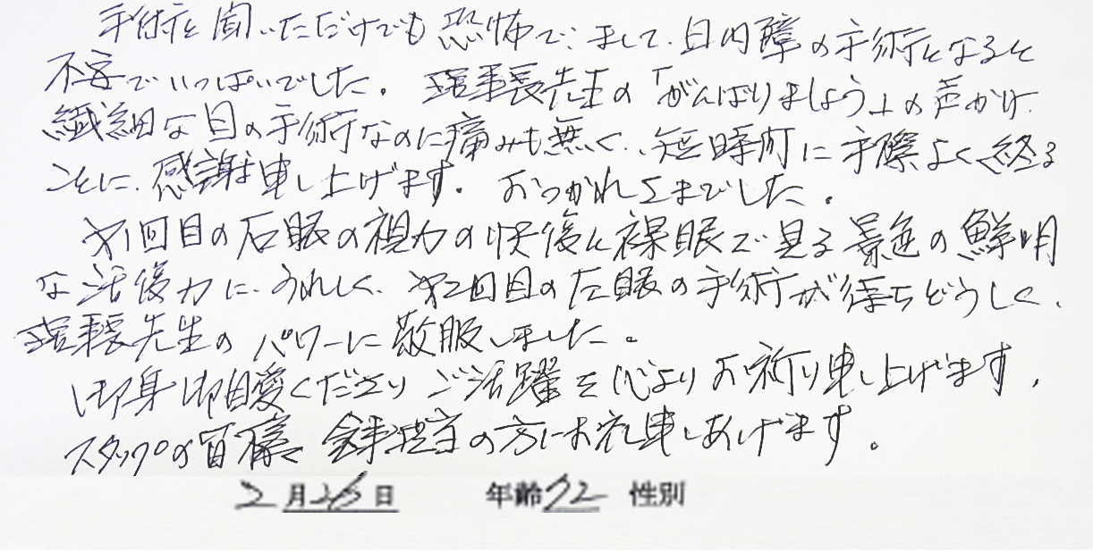 不安でいっぱいでした。理事長先生の「がんばりましょう!」の声かけ、繊細な目の手術なのに痛みも無く、短時間に手際よく終ることに、感謝申し上げます。おつかれさまでした。